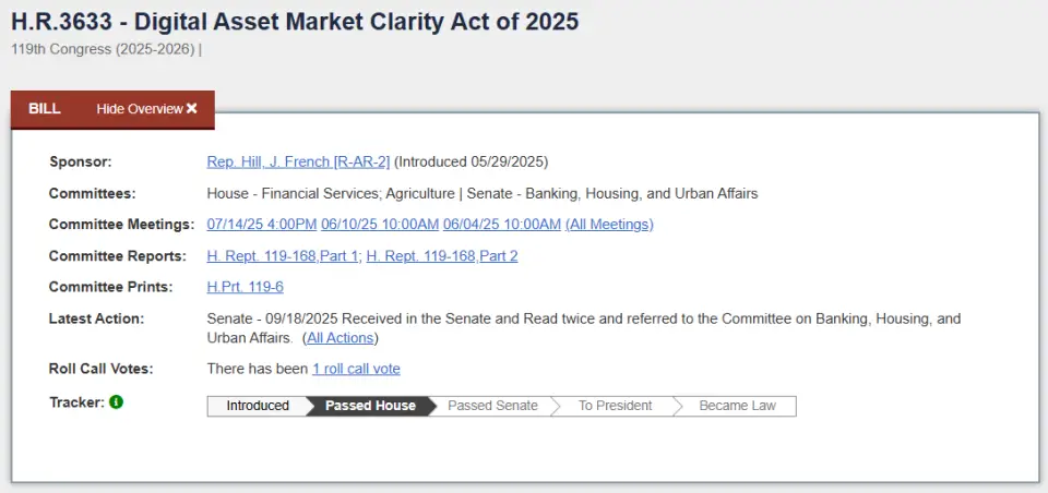 Законопроект в американской системе должен пройти несколько обязательных стадий: одобрение Палатой представителей, одобрение Сенатом (верхняя палата Конгресса), подпись президента. На начало февраля 2026 года Clarity Act прошел первый этап. Дело застопорилось в Сенате.
